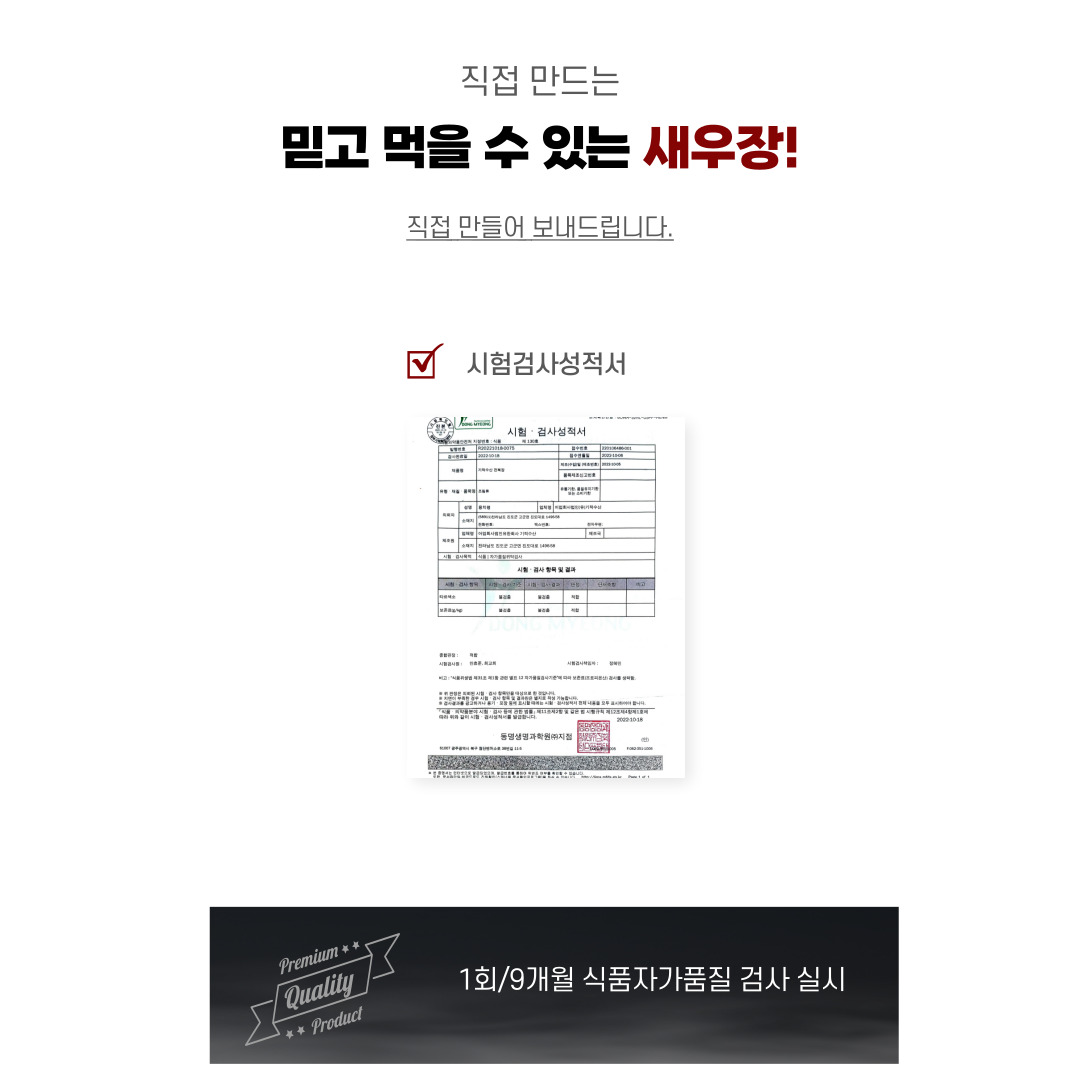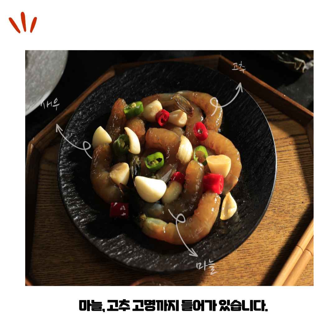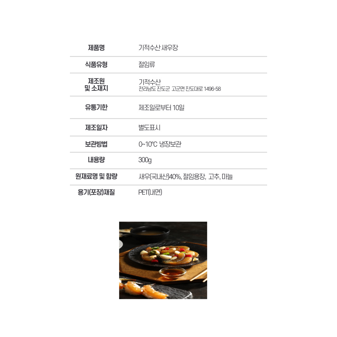 | 원재료명 (「농수산물의 원산지 표시 등에 관한 법률」에 따른 원산지 표시 포함) 및 함량(원재료 함량 표시대상 식품에 한함) | 새우(국내산), 절임용장, 양파, 고추, 마늘 |
