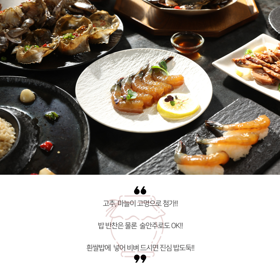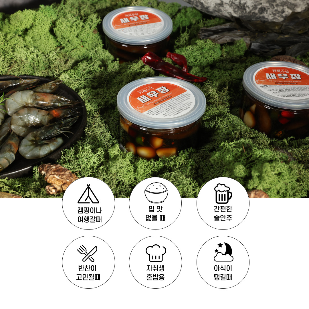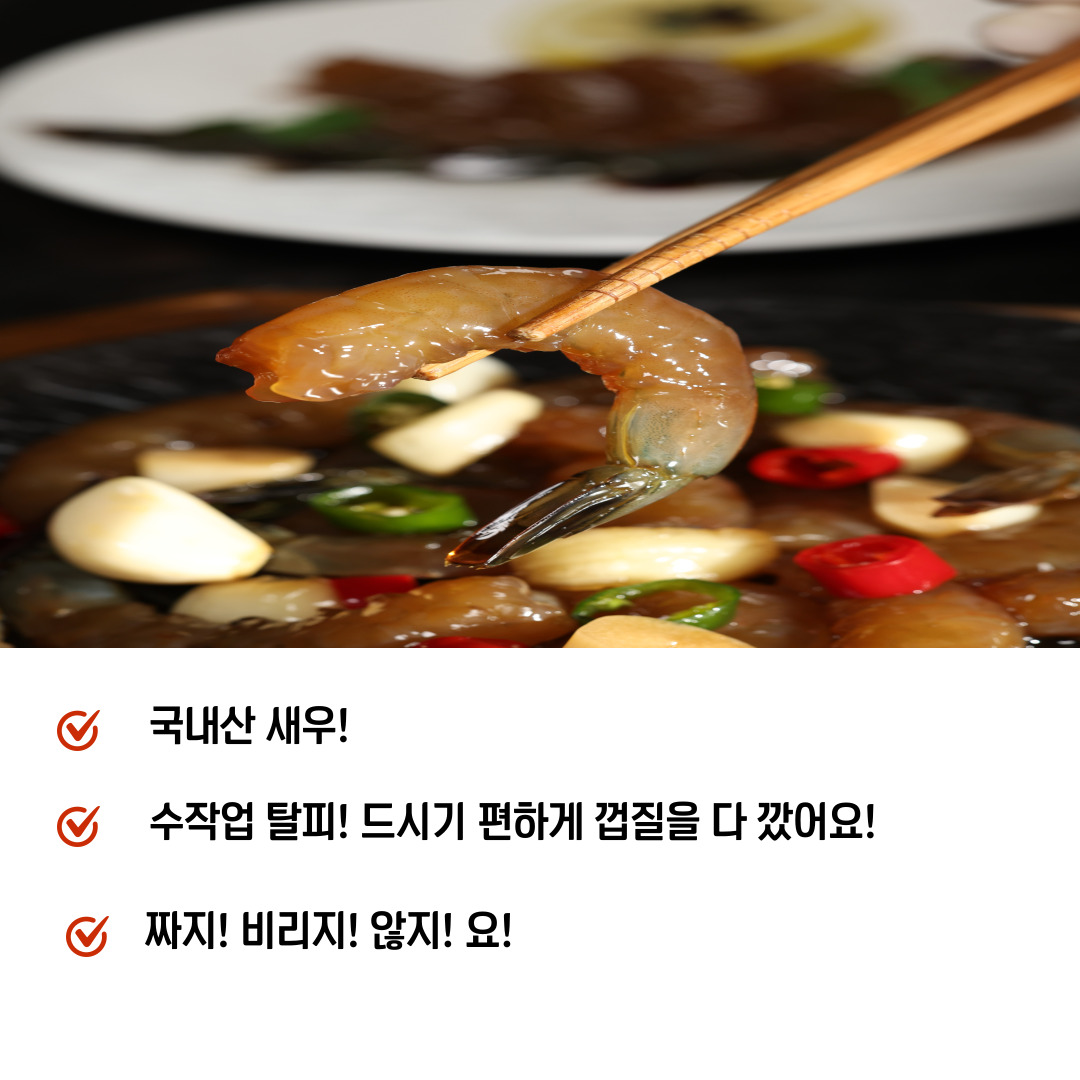 | 원재료명 (「농수산물의 원산지 표시 등에 관한 법률」에 따른 원산지 표시 포함) 및 함량(원재료 함량 표시대상 식품에 한함) | 새우(국내산), 절임용장, 양파, 고추, 마늘 |