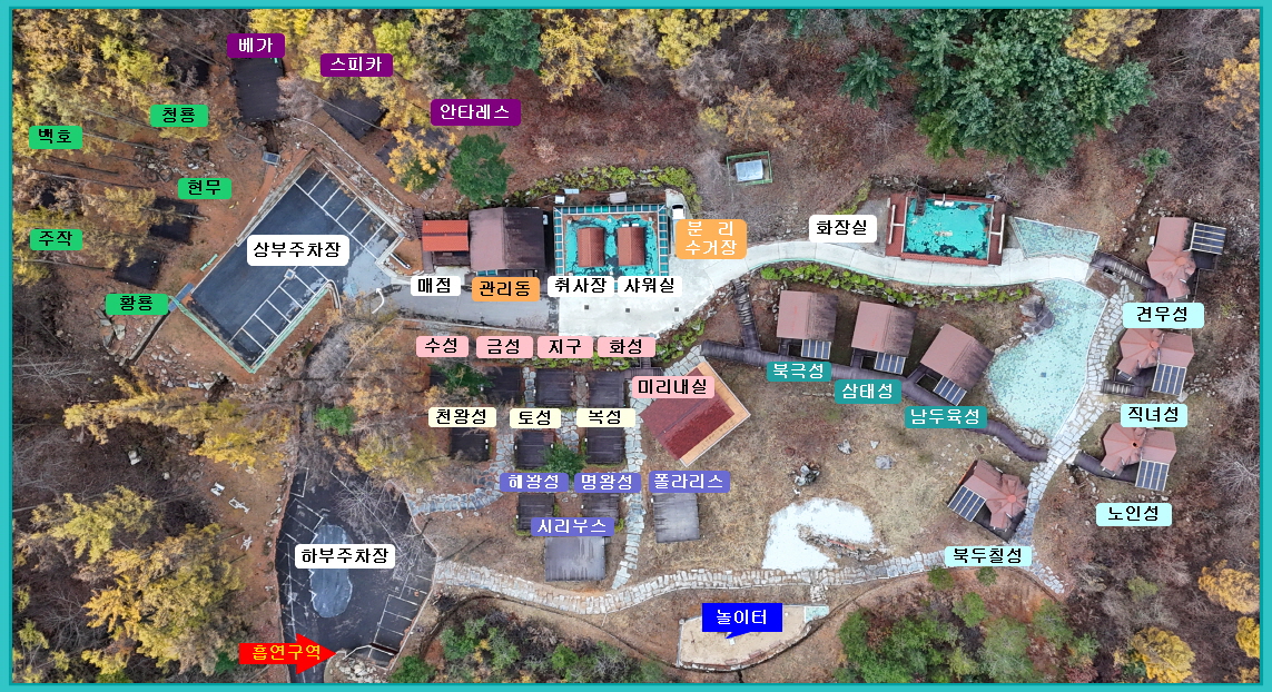 | 등급, 객실타입 | 캠핑사이트(5m*5m, 6m*8m)/객실(방갈로, 케빈하우스) |