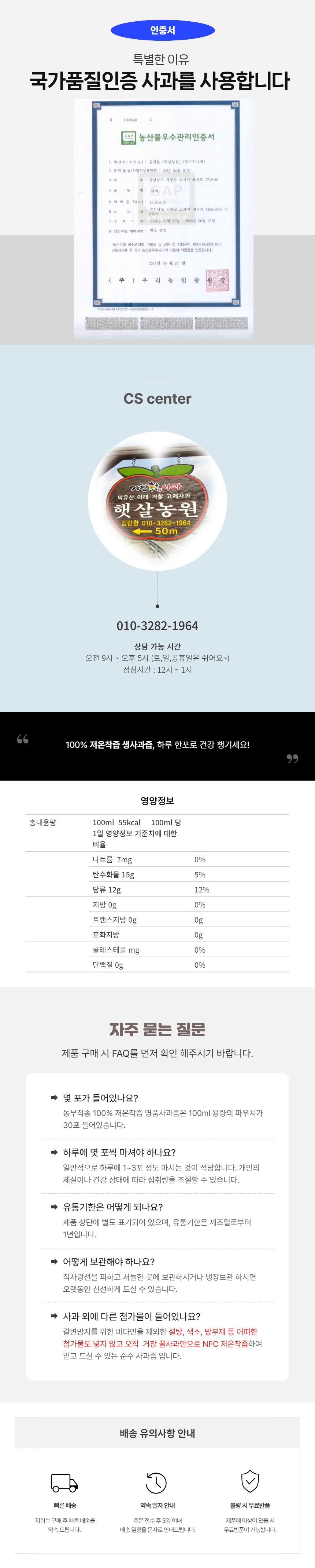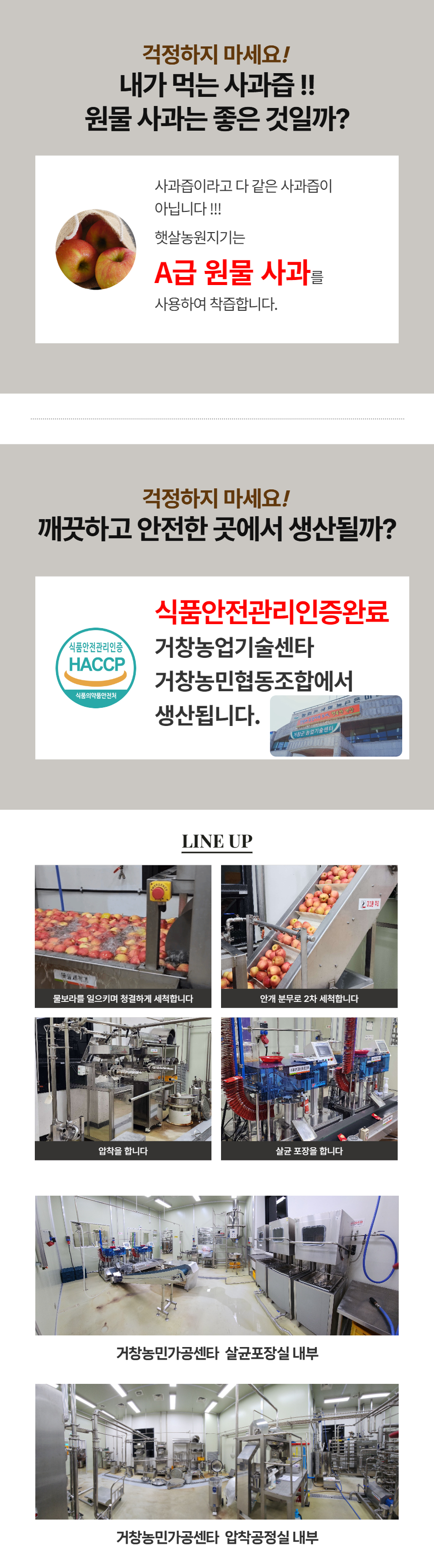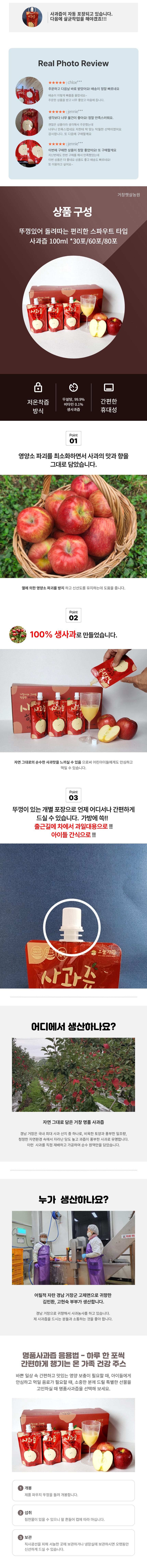 | 원재료명 (「농수산물의 원산지 표시 등에 관한 법률」에 따른 원산지 표시 포함) 및 함량(원재료 함량 표시대상 식품에 한함) | 경남 거창군 고제면 사과 99.9%, 비타민 0.1% |