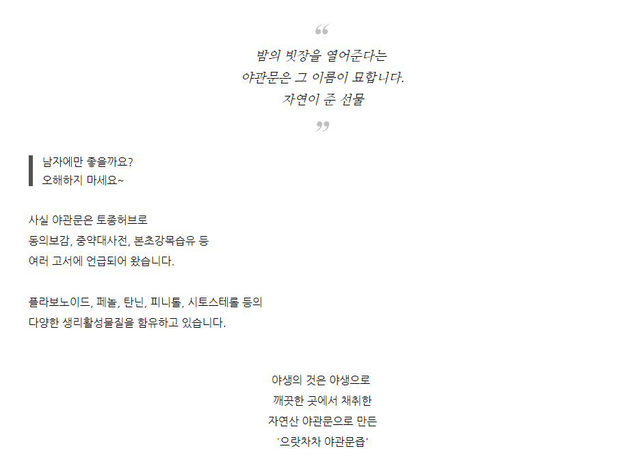 | 원재료명 (「농수산물의 원산지 표시 등에 관한 법률」에 따른 원산지 표시 포함) 및 함량(원재료 함량 표시대상 식품에 한함) | 꽃핀야관문100% |