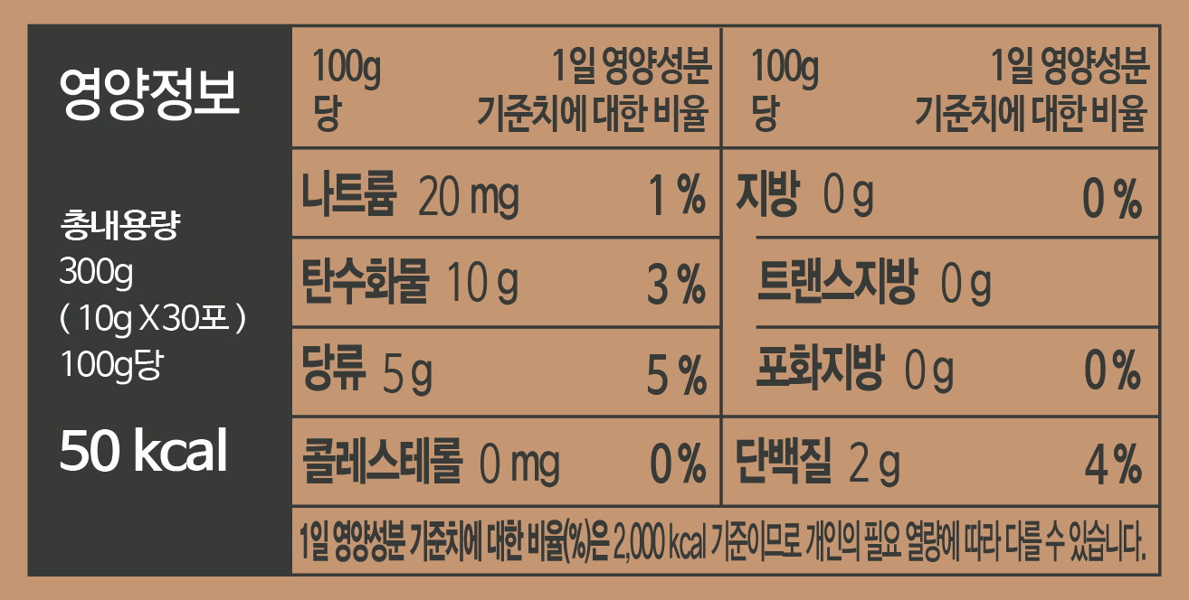 | 포장단위별 내용물의 용량(중량), 수량 | 1박스 10g*30포 |