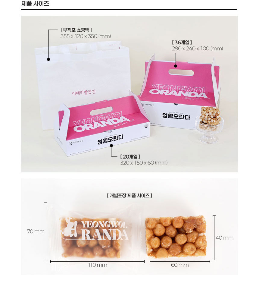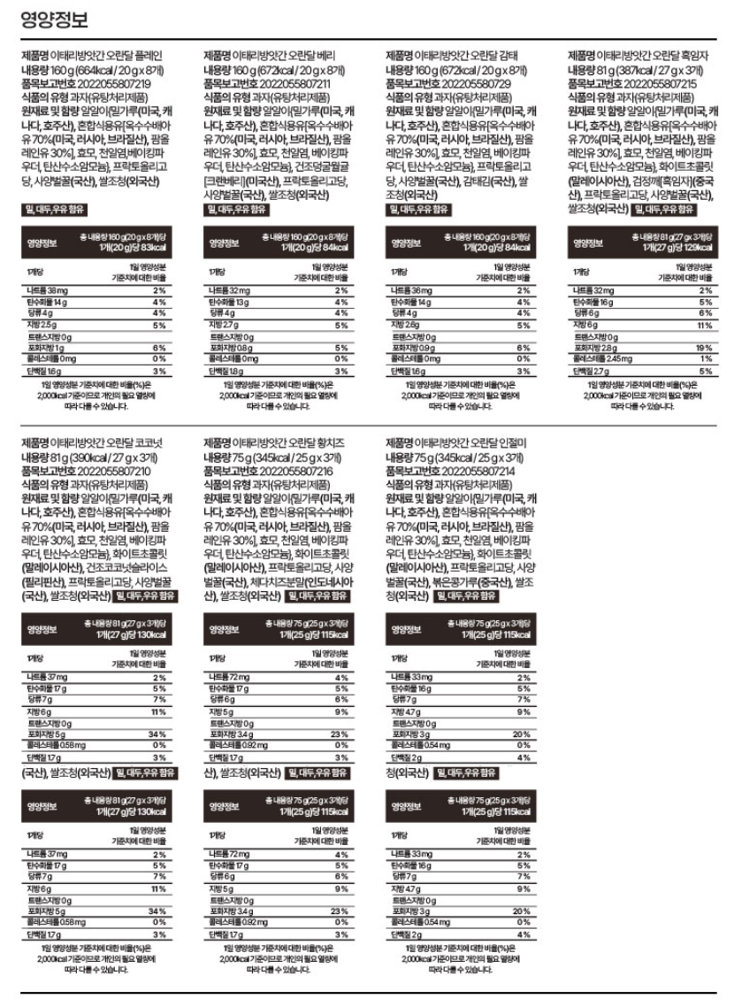 | 포장단위별 내용물의 용량(중량), 수량 | 평균 20g/총 36개(7가지 종류 혼합 구성) |