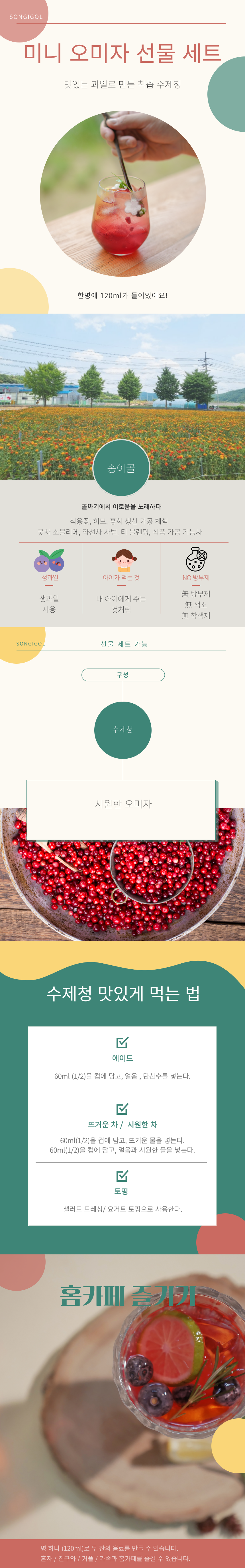 | 원재료명 (「농수산물의 원산지 표시 등에 관한 법률」에 따른 원산지 표시 포함) 및 함량(원재료 함량 표시대상 식품에 한함) | 오미자청 : 오미자50%,정백당50% (국내산),생강청:생강50%,유기농설탕50%,블루베리청:블루베리50%,정백당50%,뱅쇼청:포도즙99.5%(사과,오렌지,시나몬),와인0.5% |
