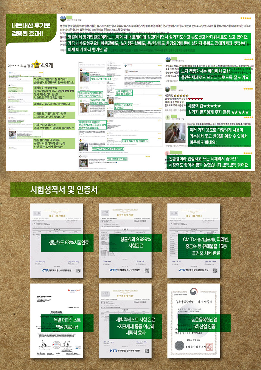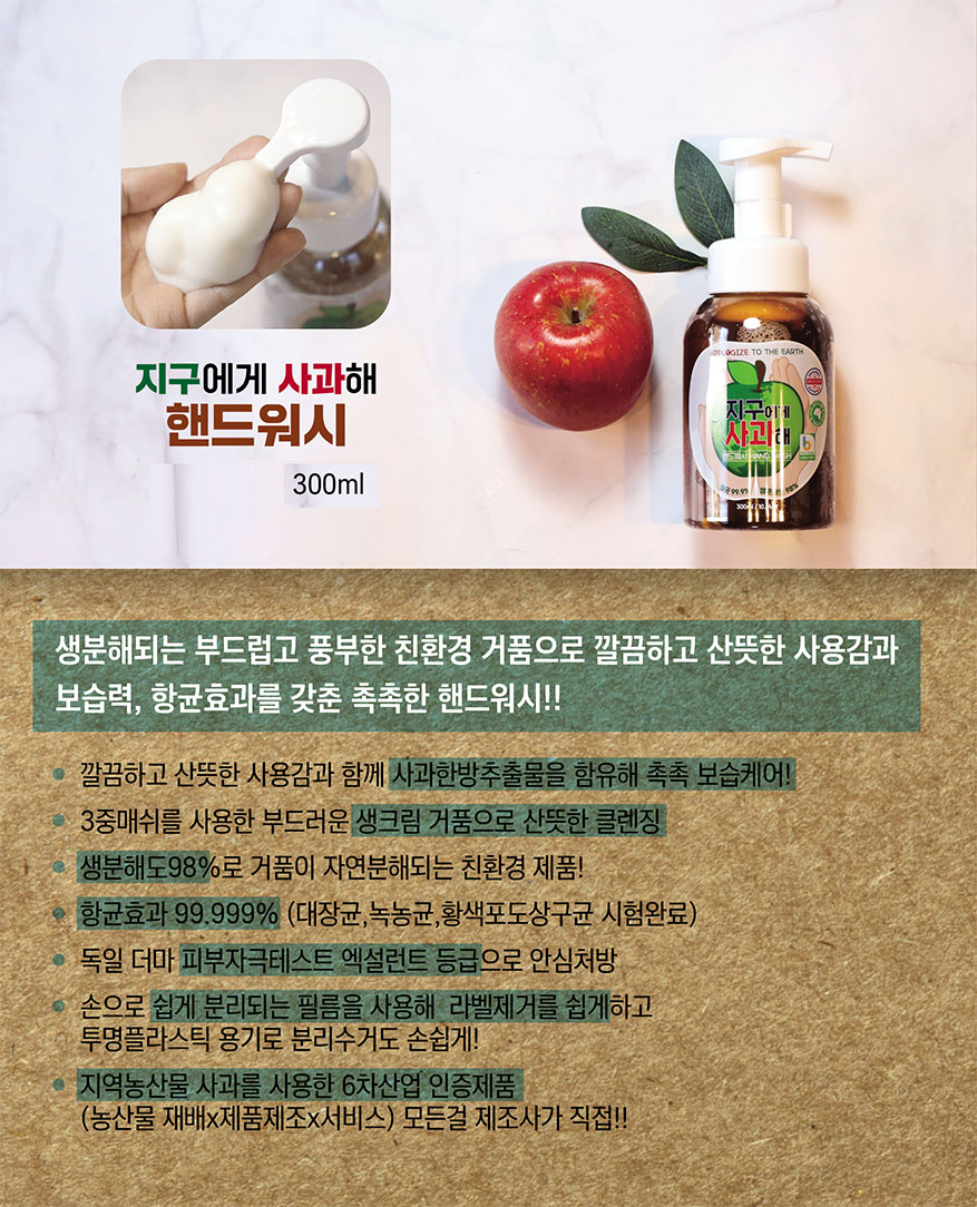 | 구성품 | 지구에게사과해 환경친화적 1종 주방세제 400g +리필형 1kg + 핸드워시300ml |