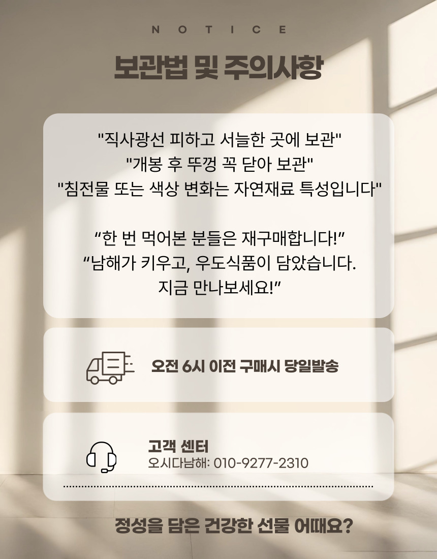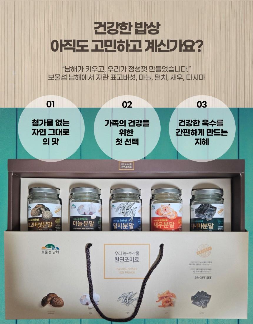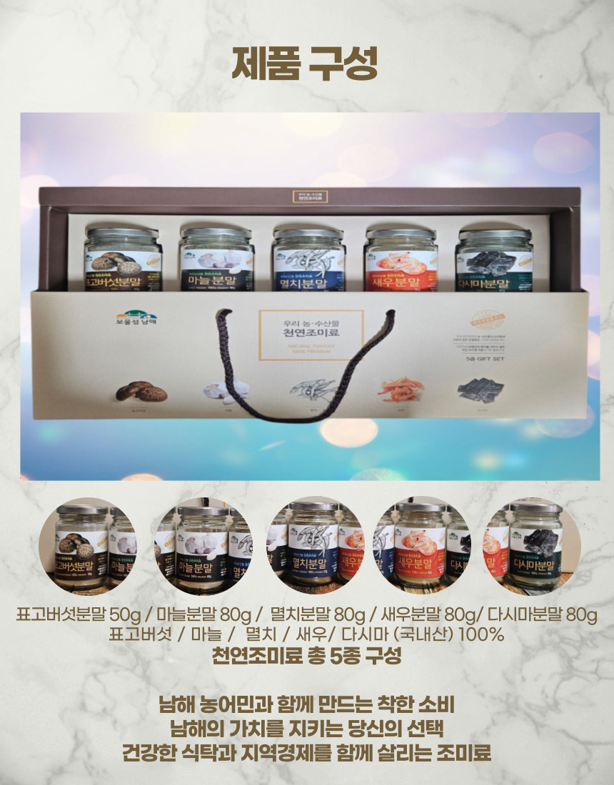 《우도식품 천연조미료 5종 세트》? 남해 자연을 담은 한 스푼의 기적청정 남해산 재료만 100% 사용한우도식품 천연조미료 5종 세트? 국내산 100% 원물만을 갈아 넣었습니다!✔ 표고버섯분말 – 깊은 감칠맛✔ 마늘분말 – 풍미와 건강을 동시에✔ 멸치분말 – 진한 육수 베이스✔ 새우분말 – 감칠맛 폭발, 찌개 필수템✔ 다시마분말 – 자연의 깊은 바다맛모든 제품, 첨가물 0%, 방부제 0%, 오직 자연 그대로.? 이럴 때 꼭 필요합니다!✅ 국ㆍ찌개ㆍ조림에 깊은 맛을 더하고 싶을 때✅ 육수 내기 귀찮을 때✅ 아이 식단에도 안심하고 넣을 수 있는 조미료가 필요할 때✅ 캠핑, 자취, 간편 요리에 진심일 때✅ 부모님, 지인에게 건강한 선물을 하고 싶을 때? 고급 선물 포장으로 마음까지 전하세요깔끔한 유리병 패키지프리미엄 선물박스 구성명절, 집들이, 감사선물, 부모님 선물로 추천!? 이렇게 사용해보세요!된장찌개에 멸치 + 다시마불고기 양념에 마늘분말해물칼국수 육수에 새우분말채소볶음이나 무침에 표고버섯분말샐러드 드레싱에 살짝 마늘 + 다시마“된장찌개에 멸치분말 한 스푼 넣었더니 깊은 맛이 확 살아나요!”“육수 내기 너무 편해요. 다시마랑 새우 분말은 캠핑 갈 때 필수템!”“부모님 드렸더니 너무 좋아하세요. 건강한 맛이라고요.”? 구성 안내? 왜 우도식품 천연조미료일까요?100% 국내산 : 남해산 농수산물만 선별하여 사용무첨가 & 무방부제 : 오직 자연 그대로의 건강한 분말다용도 활용 : 국, 찌개, 무침, 볶음, 육수까지 한 스푼으로 완성지역상생 : 남해 농어민과 함께 만드는 착한 소비선물용으로도 탁월 : 감성과 실용을 모두 담은 프리미엄 패키지청정 남해가 키운 자연 그대로의 맛을여러분의 식탁 위로 전해드립니다.? 우리 가족 밥상이 바뀝니다. 지금 바로 만나보세요! 오시다남해https://osidanamhae.co.kr