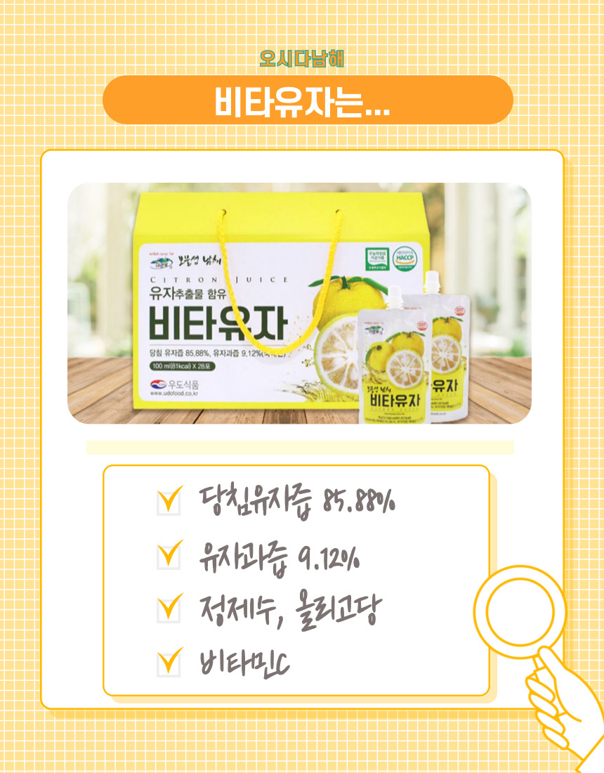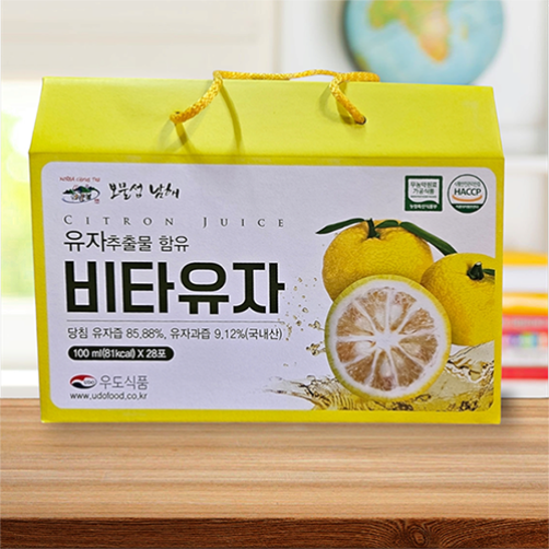 제품명: 비타유자Vita Citrus Juice유자 95%함유 유자음료액상차 100ml(81.02kcal)100ml*28ea/set당침유자즙(국내산)85.88%유자과즙(국내산)9.12%제조원: 케이팜(주)/우도식품 비타유자는청정 남해안의 온화한 기온과 햇살을 머금은친환경 무농약남해 유자만을 사용합니다.유자 고유의 향과 맛을 그대로 담은 유자음료시원하게 또는 따뜻한 음료로부담없이 드셔도 좋습니다.섭취방법: 따뜻하게 드셔도 좋고냉동실에 얼려서 샤벳트처럼 드셔도 좋습니다. https://osidanamhae.modoo.athttps://www.instagram.com/osidanamhaehttps://smartstore.naver.com/osidanamhae