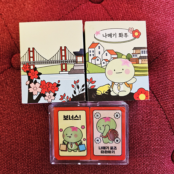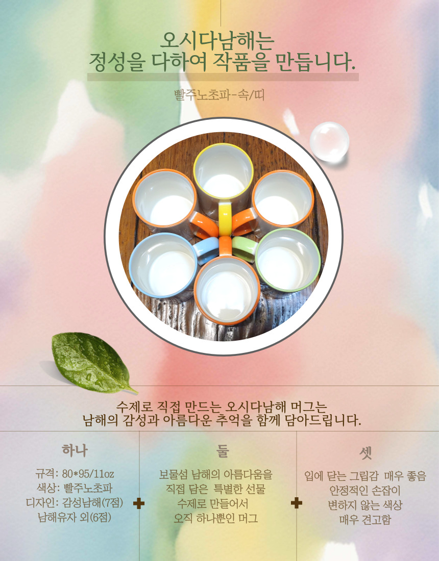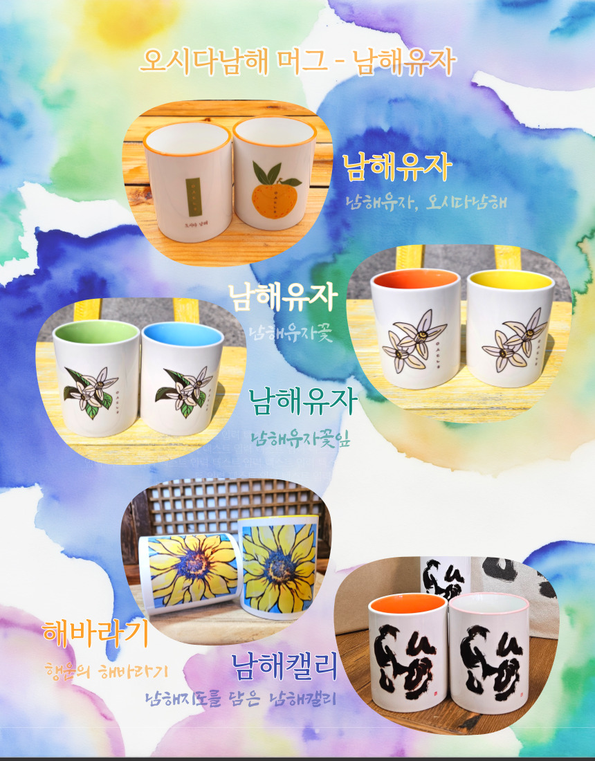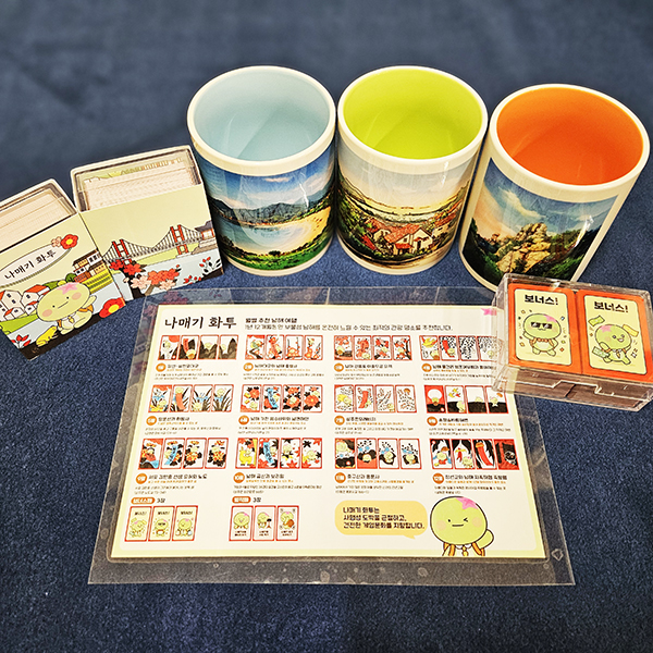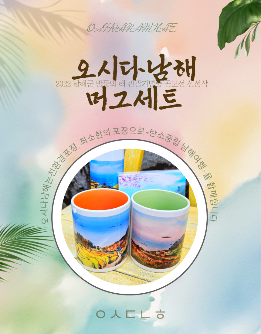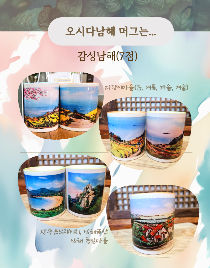 <나매기와 함께하는 감성남해 머그> 구성상품: 나매기 화투1+머그2 - 나매기 화투 -제품명: 캐릭터화투재질: 플라스틱사이즈: 36*56mm판매원: 남해군관광문화재단사용연령: 만 14세 이상나매기 화투는사행성 도박을 근절하고,건전한 게임문화를 지향합니다. 디자인: 감성남해(7점)/남해유자(4점)/행운의 해바라기/남해캘리규격 : 80mm x 95mm (가로 X 세로) 용량: 11oz 색상: 빨주노초파(5가지 색상)/속 or 띠재질(주원료) : 도자기특징 : 부드러운 수세미로 가볍게 세척 부드러운 그립감과 견고함 --------------------------------------------------------------------------------------- < 캔버스에 수채화를 직접 그린 듯 한 느낌의 고급 아트지를 사용한 감성남해 엽서 7점> <다랭이마을 봄> <다랭이마을 여름> <다랭이마을 가을> <다랭이마을 겨울> <상주은모래비치> <남해 독일마을> <남해 금산> https://osidanamhae.modoo.athttps://www.instagram.com/osidanamhaehttps://smartstore.naver.com/osidanamhae