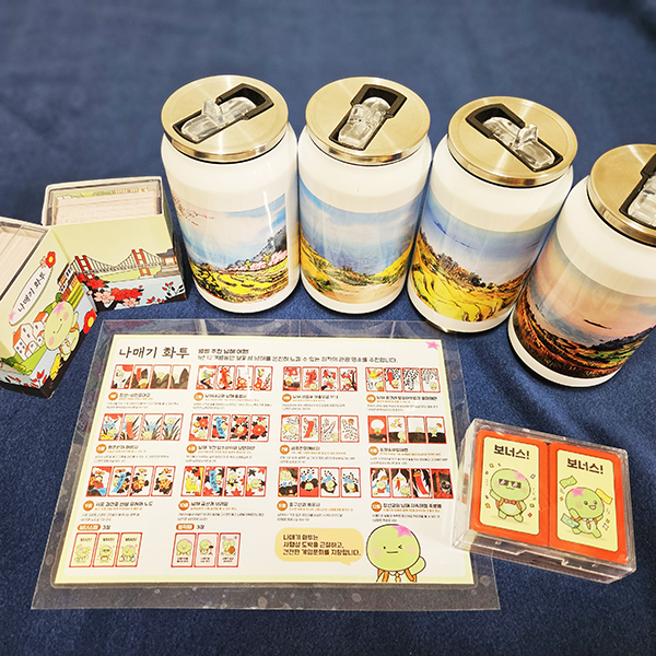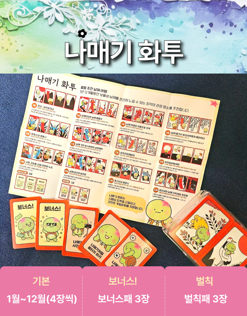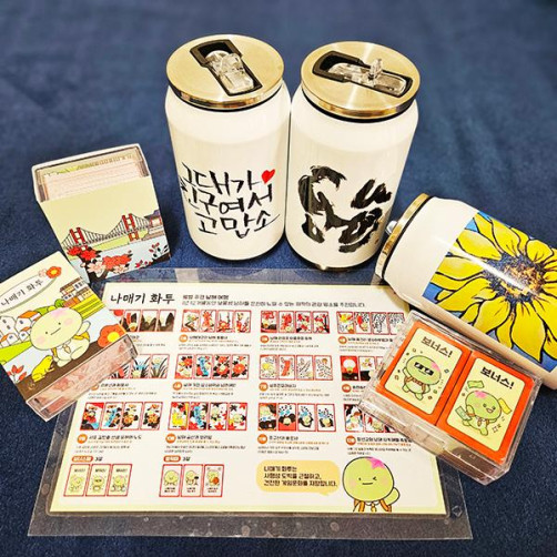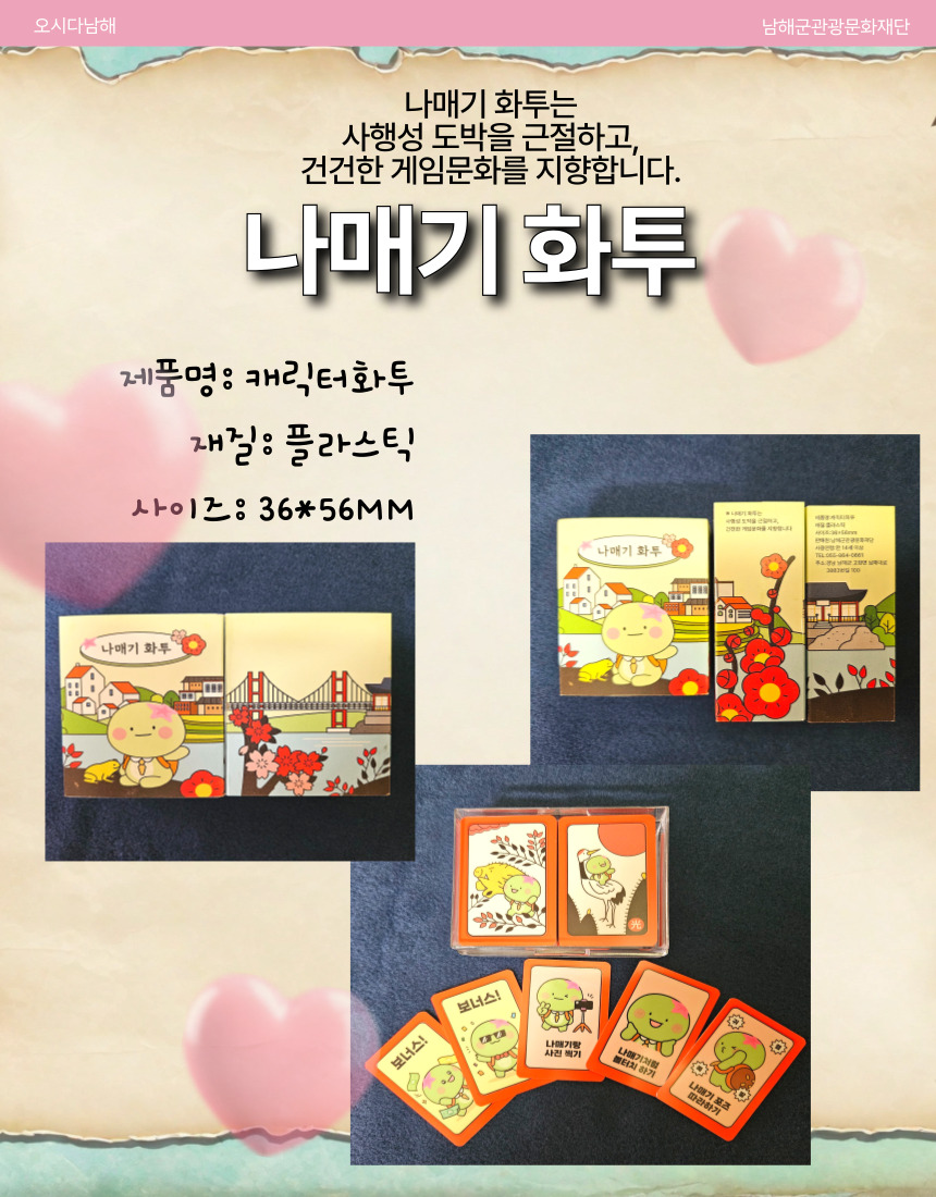 구성상품: 나매기 화투1+텀블러1 <나매기와 함께하는 감성남해 텀블러> - 나매기 화투 -제품명: 캐릭터화투재질: 플라스틱사이즈: 36*56mm판매원: 남해군관광문화재단사용연령: 만 14세 이상나매기 화투는사행성 도박을 근절하고,건전한 게임문화를 지향합니다. - 감성남해 텀블러 -용량: 350ml냉&온 기능이 탁월한 빨대형 텀블러맥주캔 사이즈로 아주 익숙한 텀블러윤슬처럼 반짝이는 멋스런 텀블러디자인: 감성남해(7점)/남해유자(4점)/행운의 해바라기/남해캘리/친구 --------------------------------------------------------------------------------------- < 캔버스에 수채화를 직접 그린 듯 한 느낌의 고급 아트지를 사용한 감성남해 엽서 7점> <다랭이마을 봄> <다랭이마을 여름> <다랭이마을 가을> <다랭이마을 겨울> <상주은모래비치> <남해 독일마을> <남해 금산> https://osidanamhae.modoo.athttps://www.instagram.com/osidanamhaehttps://smartstore.naver.com/osidanamhae