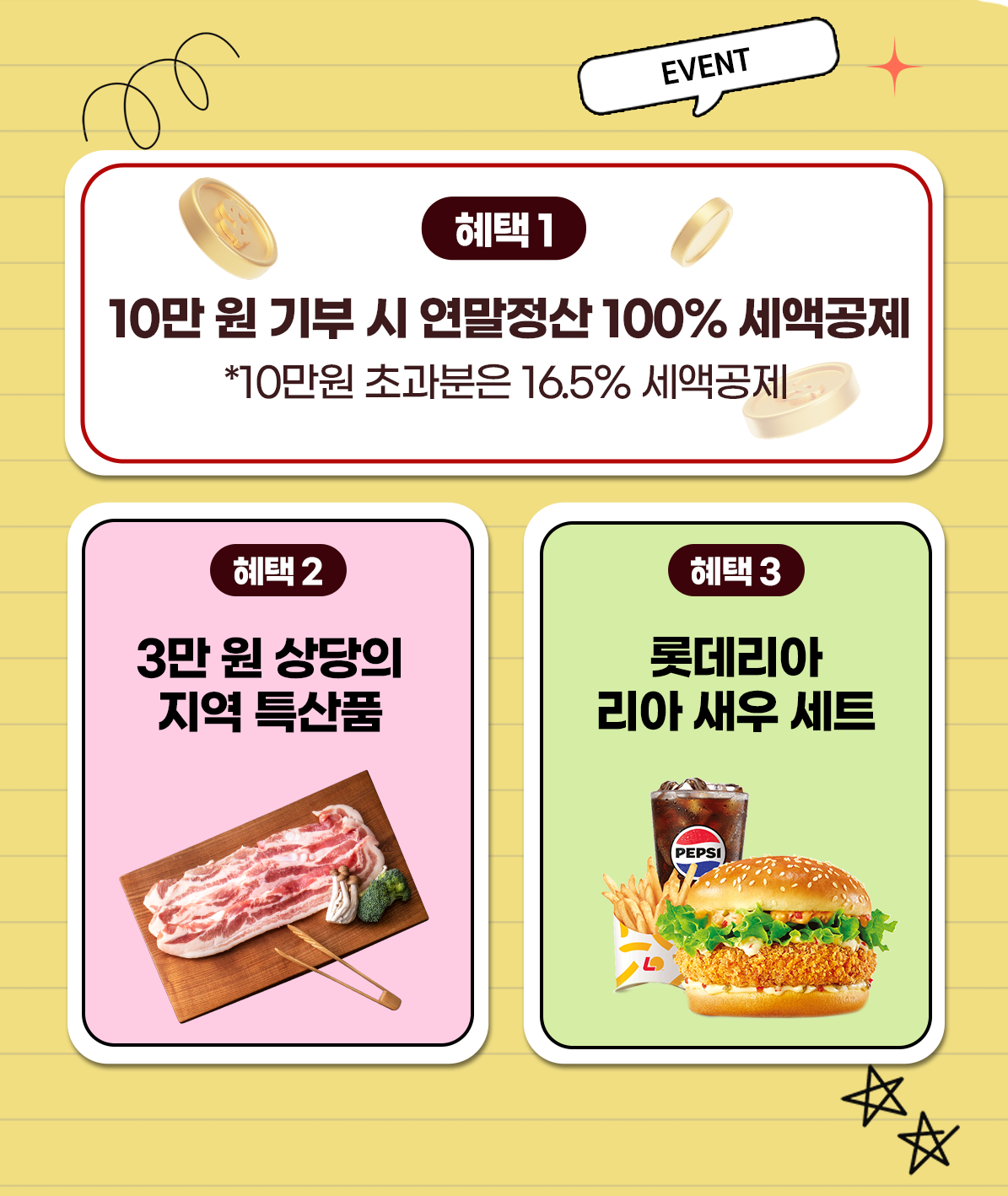 3️⃣ 10만원 세액공제, 3만원 답례품은 기본! 여기에 롯데리아 리아 새우 세트 교환권을 추가로 드립니다.