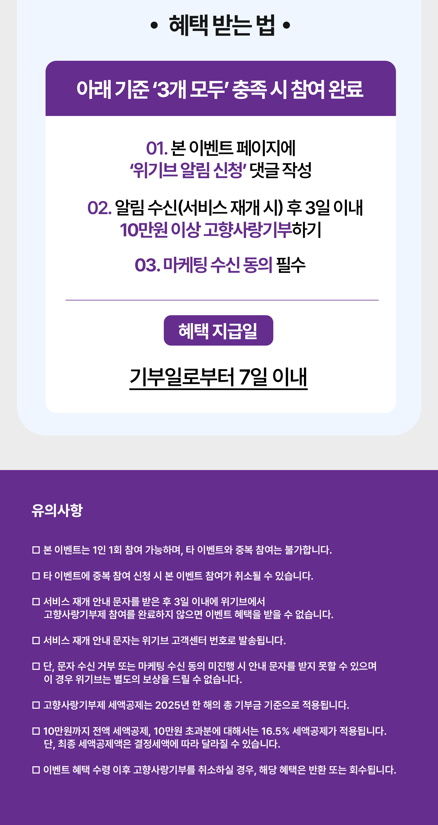 알림 수신 후 3일 이내에 10만원 이상 기부를 완료합니다. (기부 시 마케팅 수신 동의 필수)