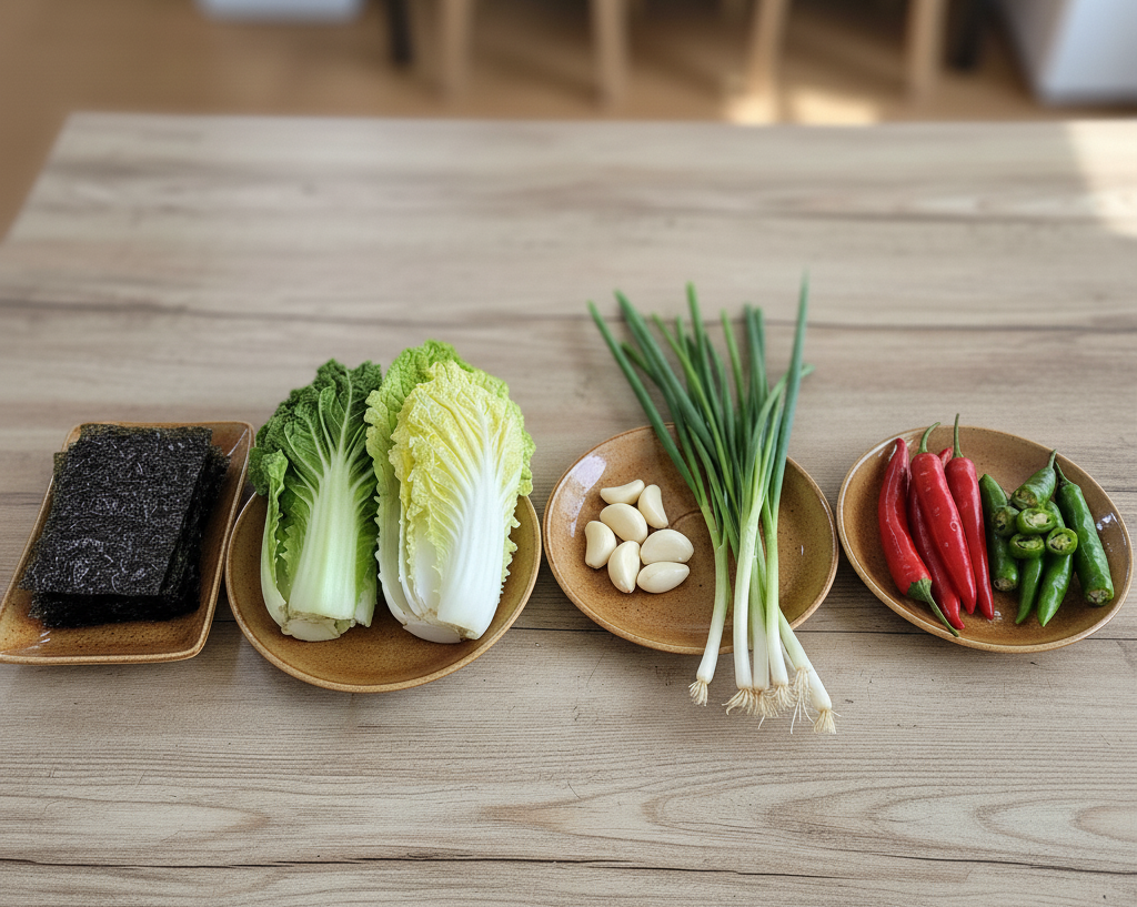 필수 조합: 생김, 쌈배추(또는 알배추), 마늘, 쪽파, 고추